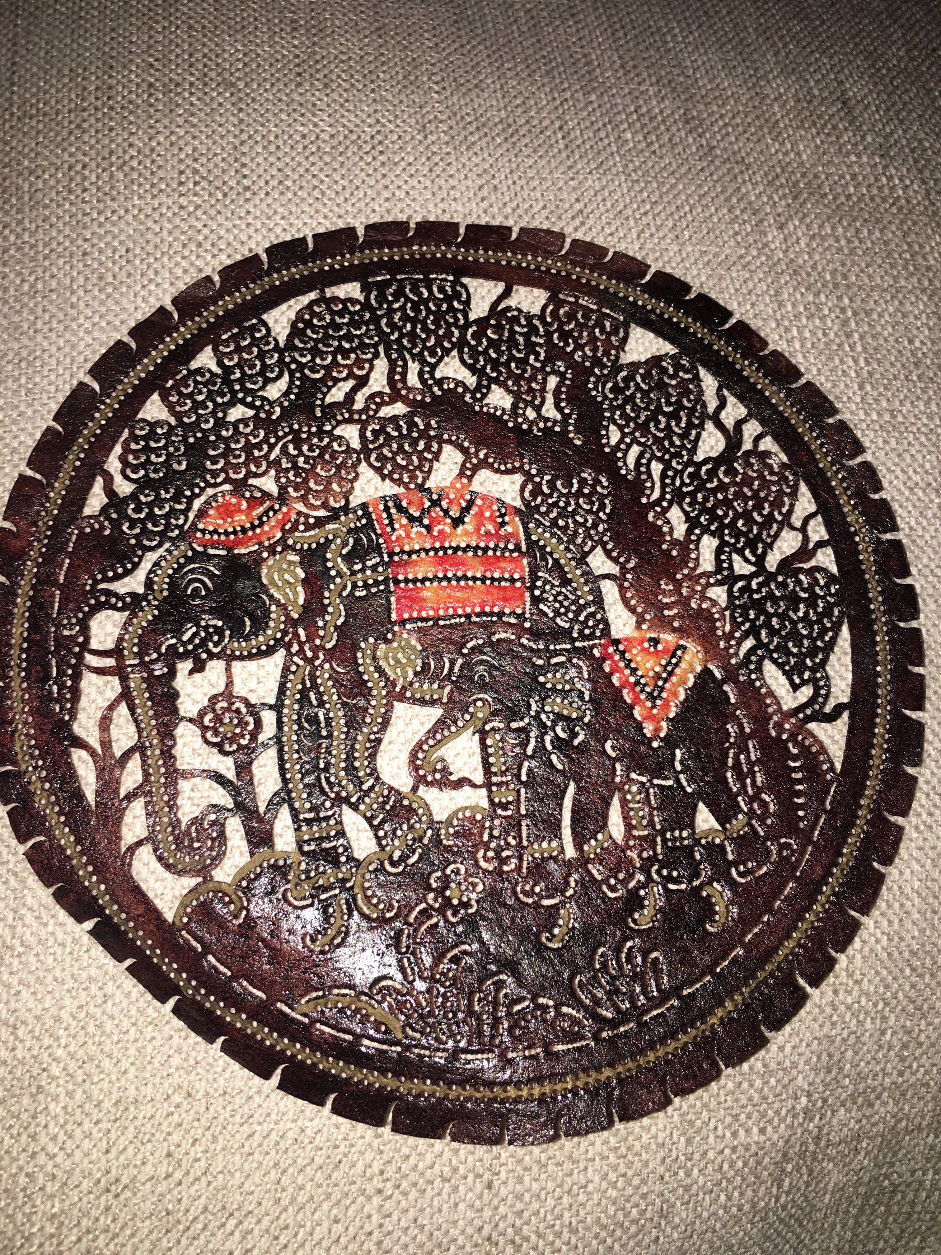 I came across a gentleman carving what looked to be leather and his work was so incredible I had to buy one. It was elephants carved out of buffalo skin.